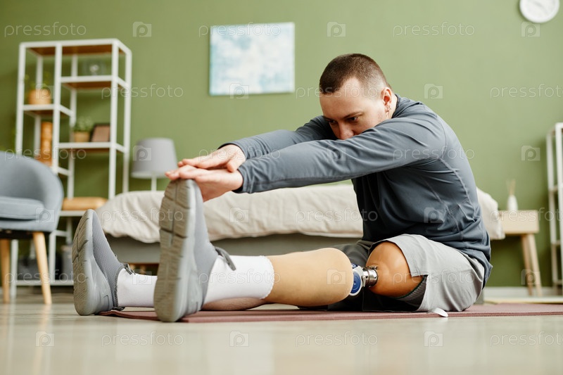 Человек с протезированной ногой делает упражнения по растяжению