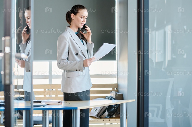 Молодая женщина-директор деловой компании, разговаривающая по мобильному телефону