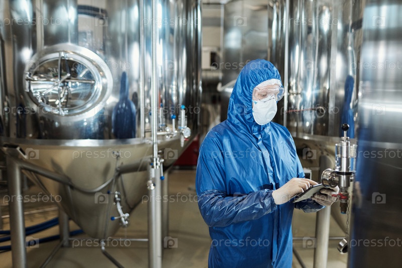 Мужчина в защитном снаряжении и маске работает на промышленной химической фабрике