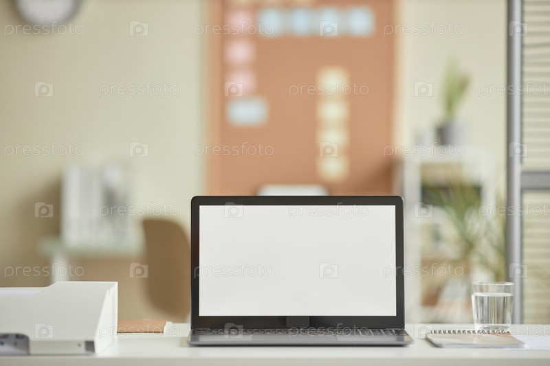 Минимальный открытый ноутбук с пустым белым экраном макетом на столе в офисе