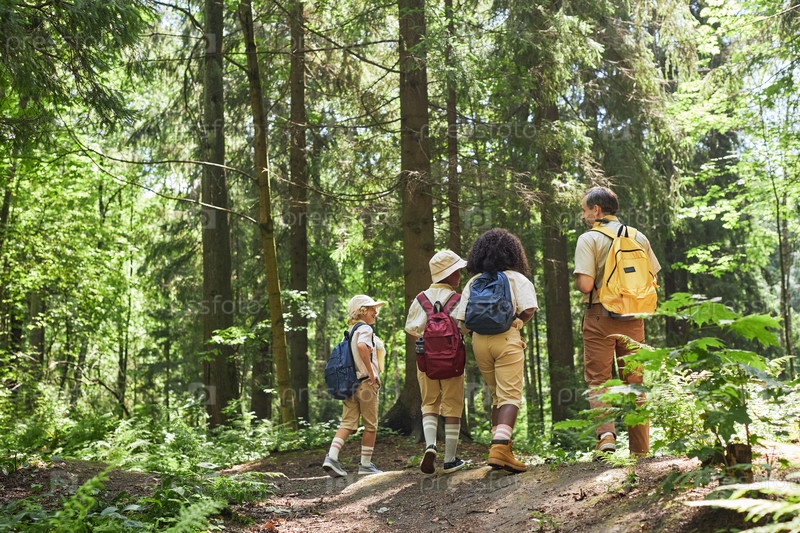 Разнообразная группа скаутов ходят по лесу с взрослым лидером