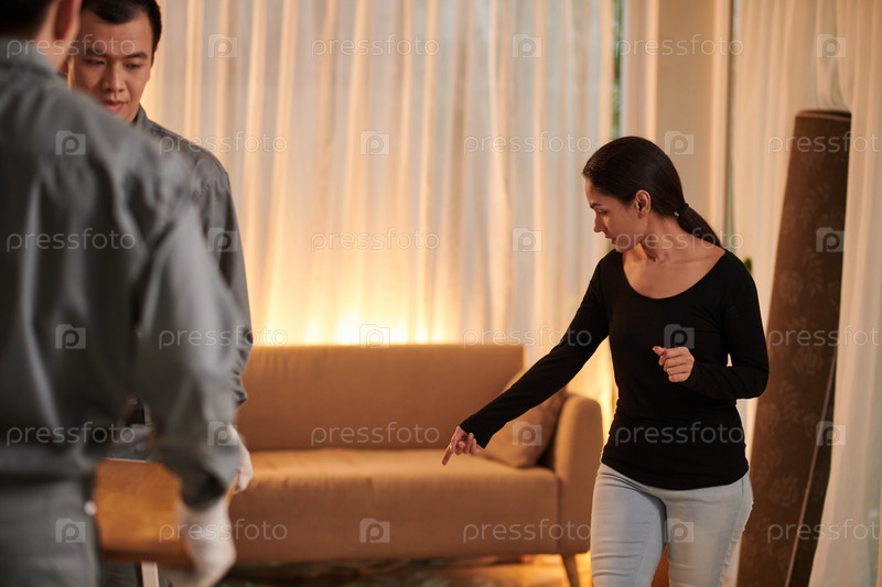 Переселенцы приносят диван в квартиру