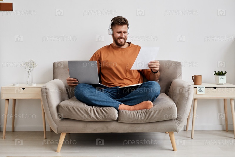 Счастливый молодой человек с ноутбуком на коленях, глядящий на документ