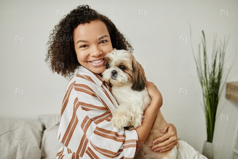 Откровенная молодая чернокожая женщина, держащая милую собаку и улыбающаяся на камеру дома