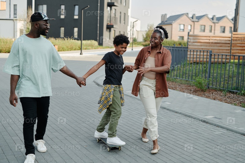 Семья учит сына кататься на скейтборде на свежем воздухе