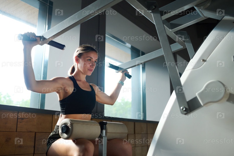 Женщина тренирует мышцы на спортивном оборудовании