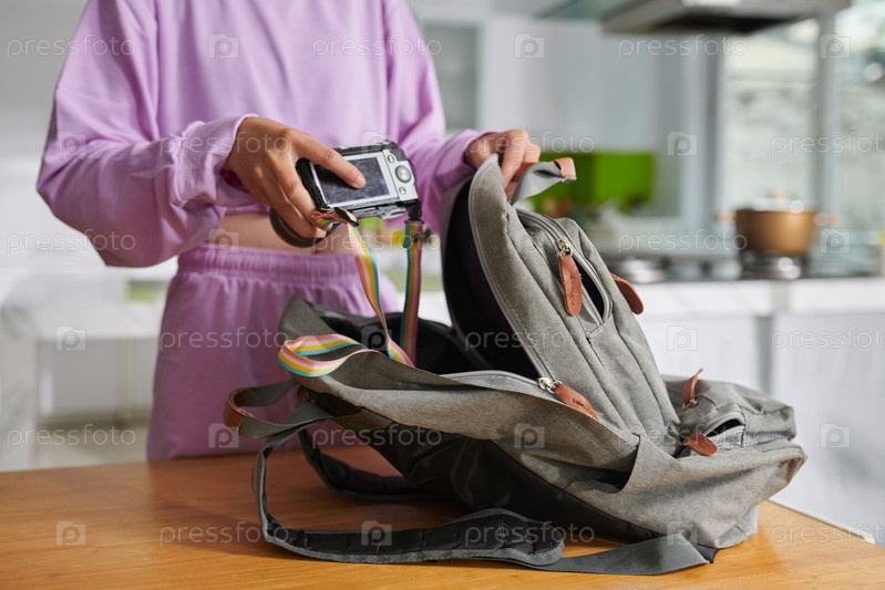 Девушка, которая кладет камеру в рюкзак