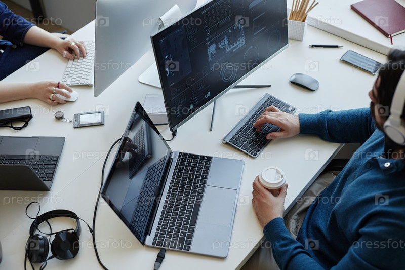 Выше вид ноутбука и монитор настольного компьютера с данными на экране