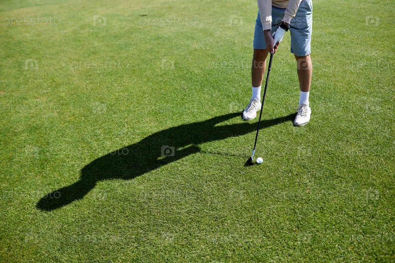 Низкий участок человека, играющего в гольф на зеленой траве и стремящегося к идеальному выстрелу