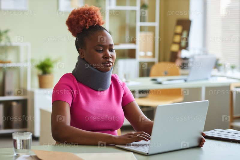 Черная женщина с брекетом на шее работает за столом в офисе, используя ноутбук