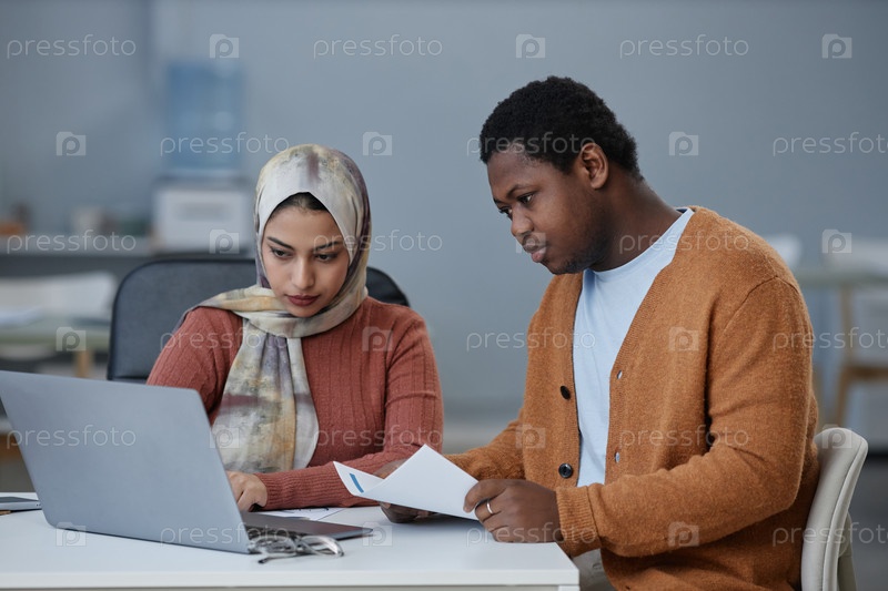 Молодой афроамериканский бизнесмен с документом смотрит на экран ноутбука