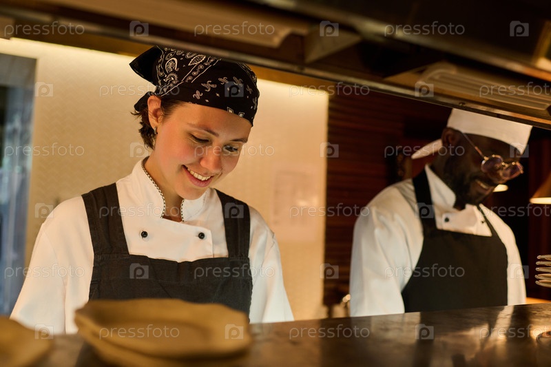 Счастливая молодая женщина в форме стоит у прилавка и готовит еду