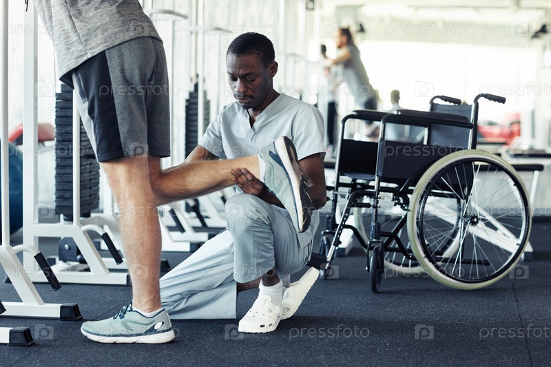 Терапевт делает упражнения на ноге пациента