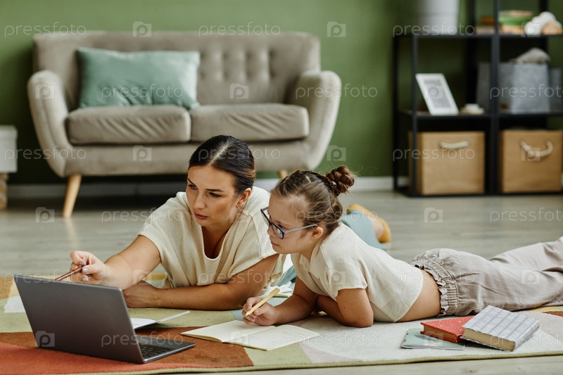 Девочка с синдромом Дауна учится вместе с мамой на полу