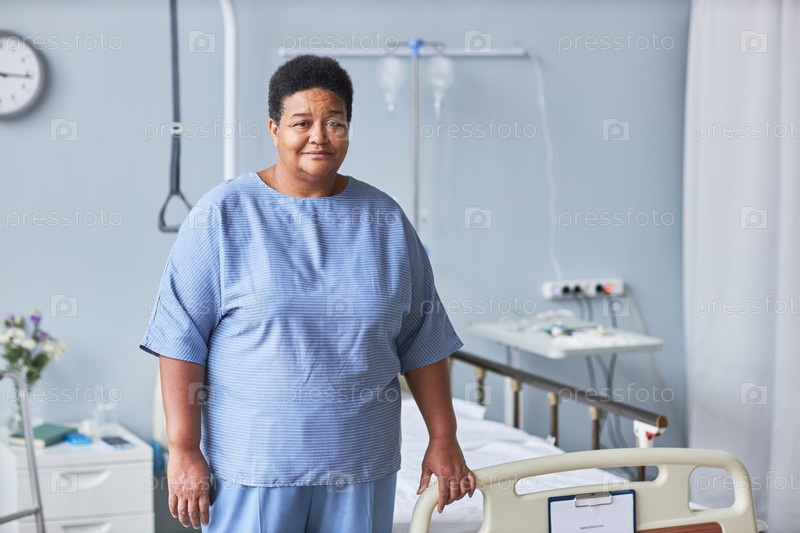 Чернокожая пожилая женщина стоит у кровати в больничной комнате и смотрит на камеру