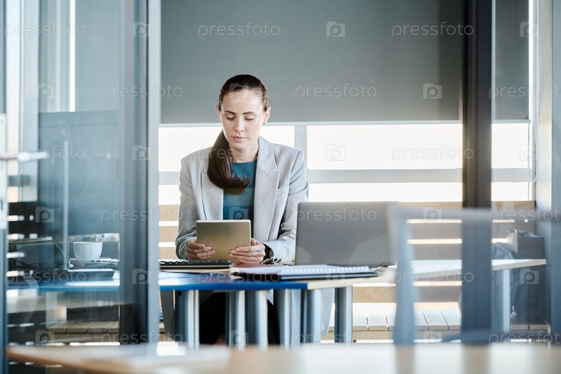 Молодая серьезная деловая женщина или стажер с сетью планшетов в офисе