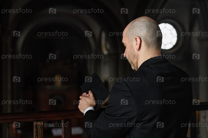 Пастор с Библией молится в церкви