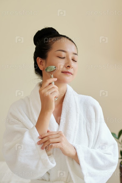 Женщина массажирует лицо с помощью нефритового ролика
