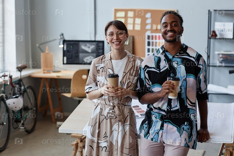 Коллеги по работе смотрят на камеру и держат кофе