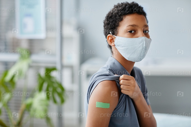 Девушка-подросток показывает пластырь от вакцинации