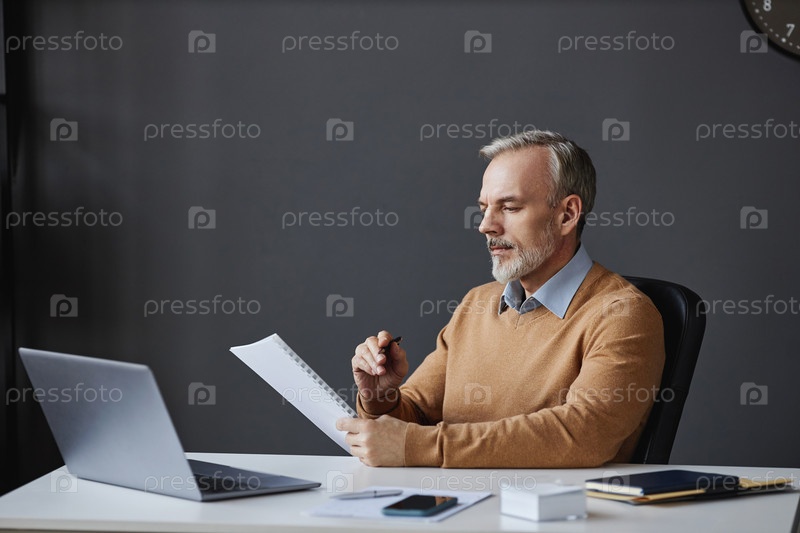 Боковой вид зрелый мужчина читает документ на рабочем месте в офисе