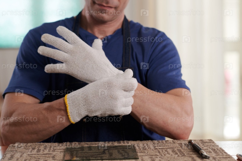 Работник, носящий перчатки перед работой