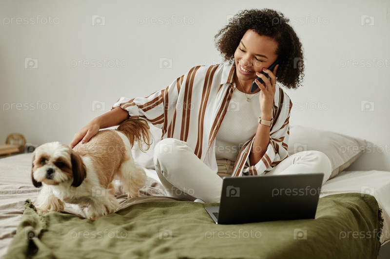 Откровенная молодая чернокожая женщина, работающая из дома на кровати и играющая с собакой