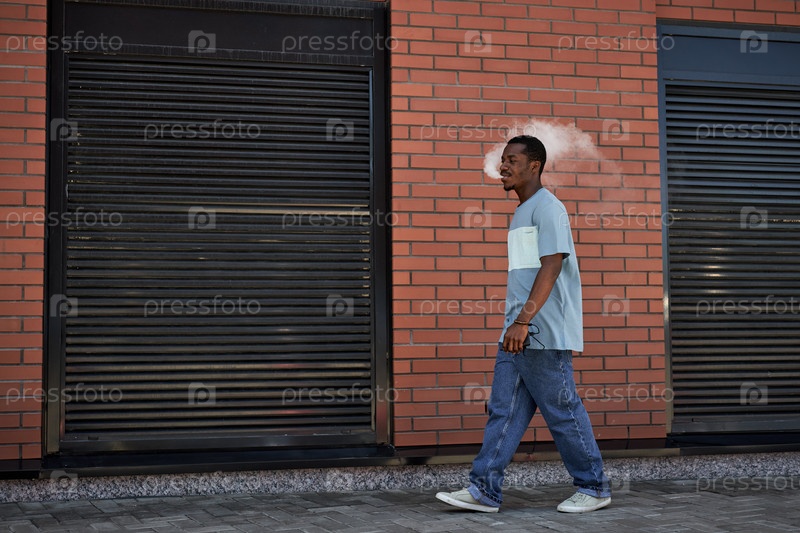 Боковой вид молодого чернокожего мужчины в повседневной одежде, идущего по кирпичной стене