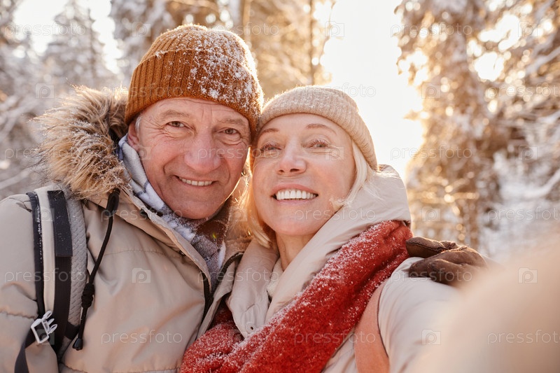 Пожилая пара делает селфи зимой