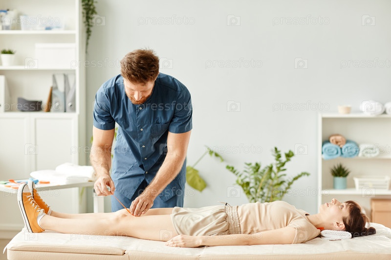 Реабилитационный терапевт кладет физкасету на женщину