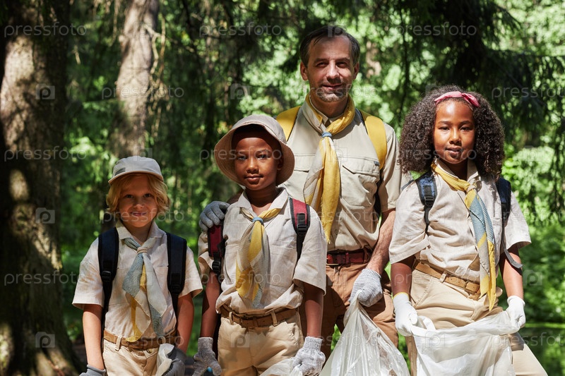 Группа скаутов с взрослым лидером смотрит на камеру в лесу