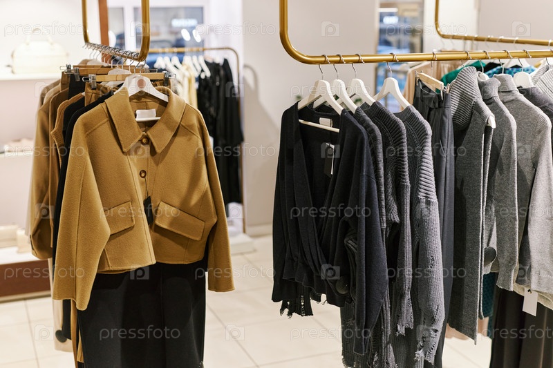 Фонное изображение стеллажей для одежды с коллекцией осенней моды в бутике