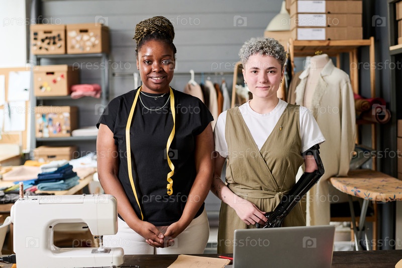 Две счастливые молодые межкультурные модные дизайнеры, стоящие на рабочем месте