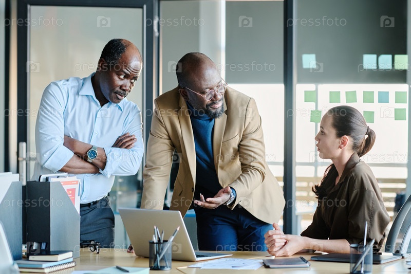 Два бизнесмена смотрят на молодую коллегу во время презентации