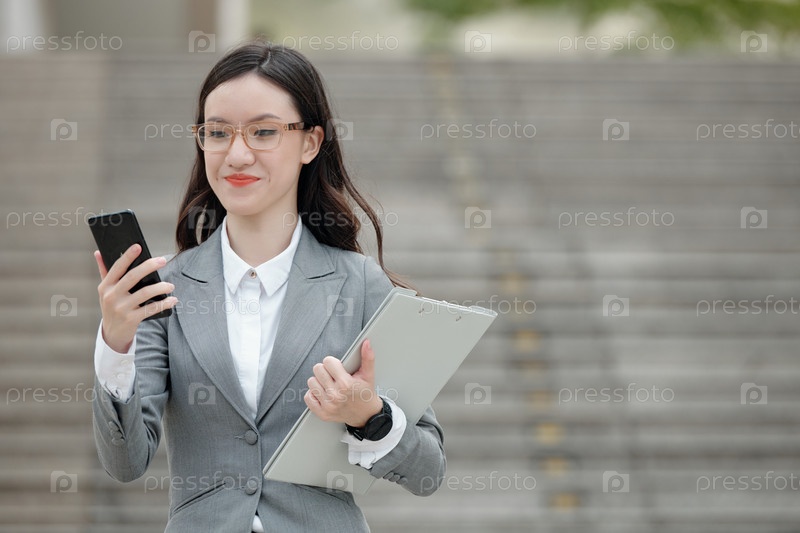 Positive Businesswoman Reading Text Message Позитивное текстовое сообщение