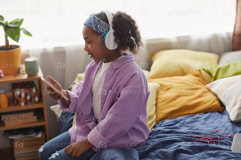 Черная девушка, использующая смартфон, сидит дома на кровати и носит наушники
