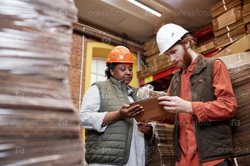 Работники, использующие планшеты на фабрике