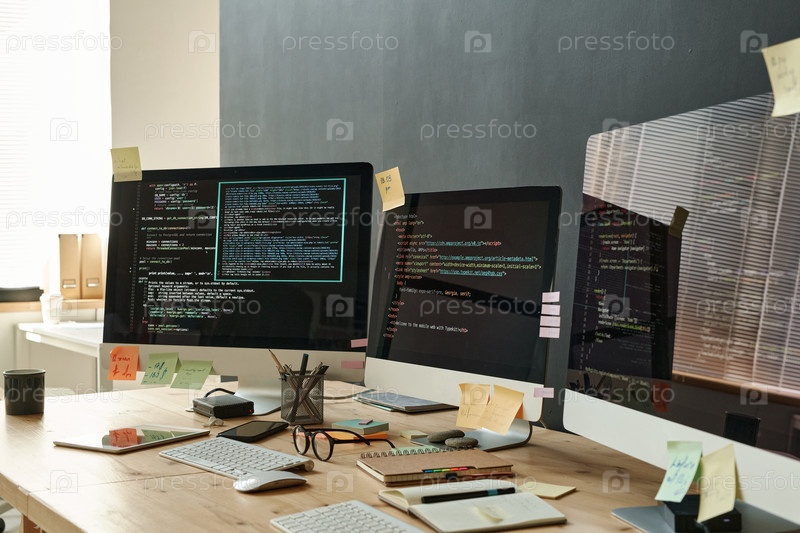 Группа компьютерных экранов с кодированными данными, стоящих на деревянном столе