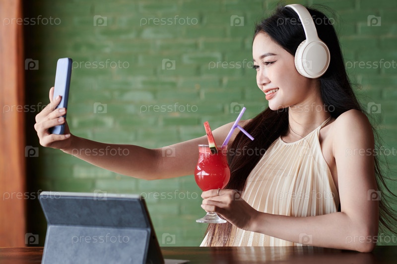 Женщина, делающая селфи в кафе