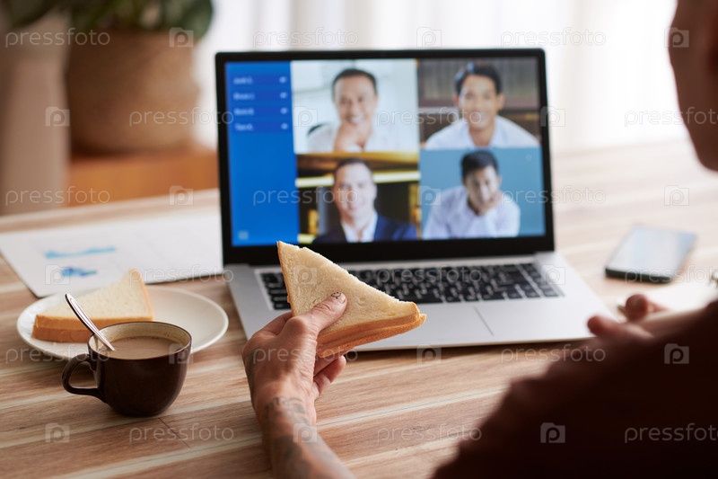 Употребление пищи во время онлайн-встречи мужчина