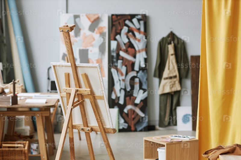 Рабочее место современного художника с холстом на деревянном эстафете