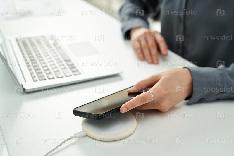 Женщина, использующая беспроводное зарядное устройство в офисе