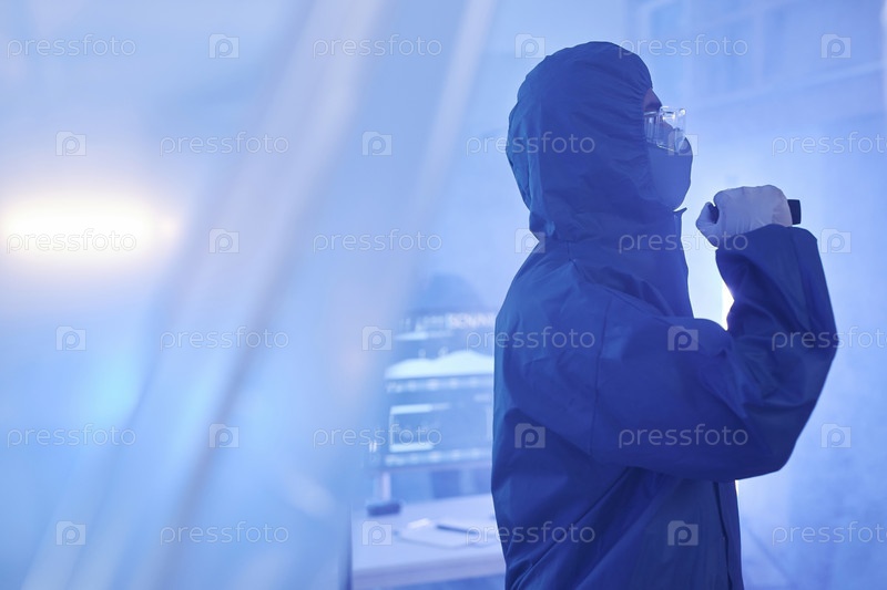 Мужчина в защитном костюме заходит с фонариком в опасную зону биологического риска