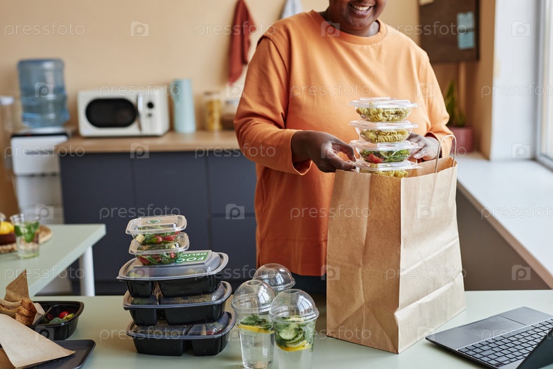 Обрезанный снимок чернокожей женщины, распаковывающей заказ на доставку еды