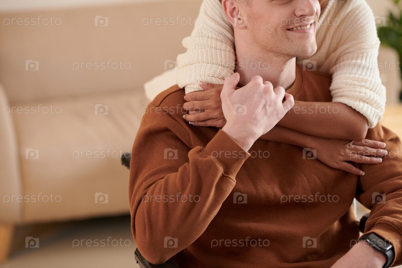 Женщина обнимает бойфренда в инвалидном кресле