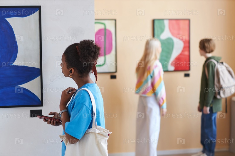 Красочный снимок разнообразной группы подростков, смотрящих на искусство