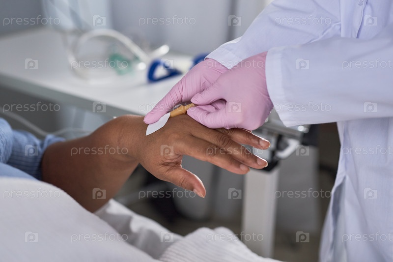 Ближайшее изображение молодой медсестры, помещающей ИВ в руку