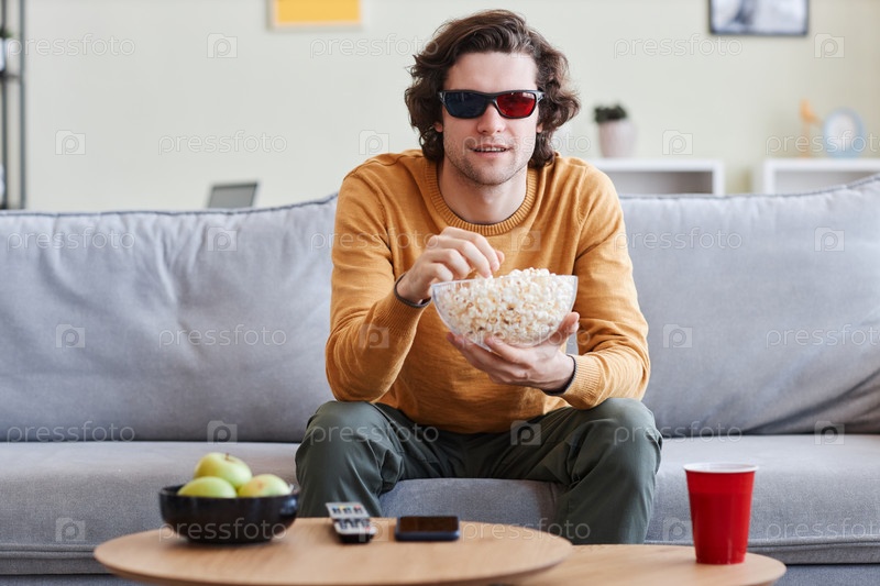 Мужчина смотрит 3D-фильм дома и носит стереоглаза