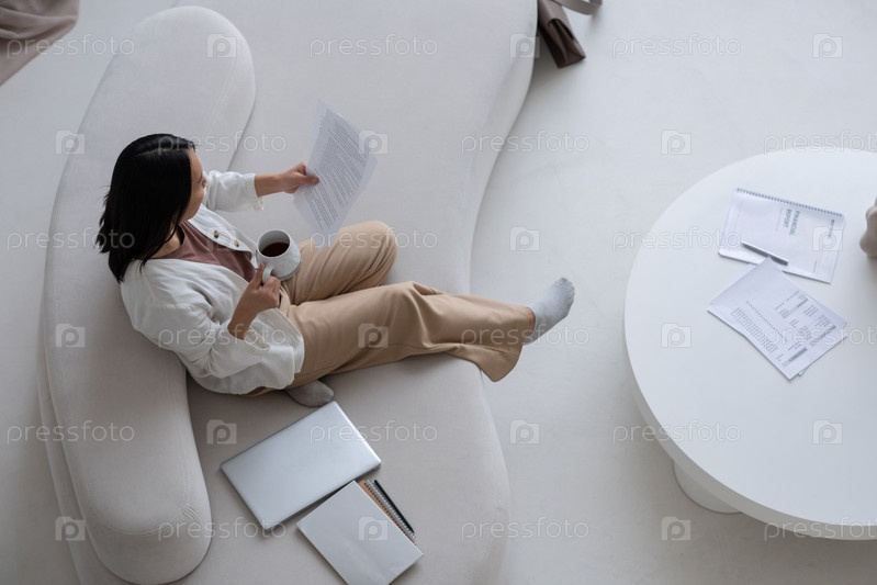 Молодая современная женщина с напитком сидит на диване и просматривает бумаги