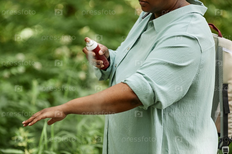 Боковой вид крупный снимок чернокожей женщины, распыляющей руки репеллентом от насекомых на открытом воздухе